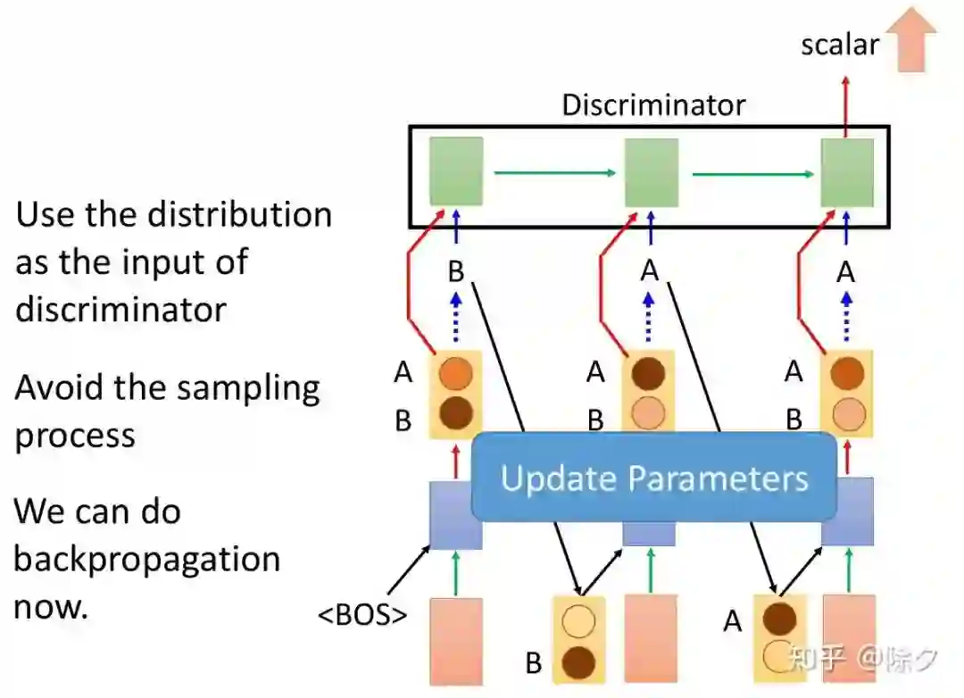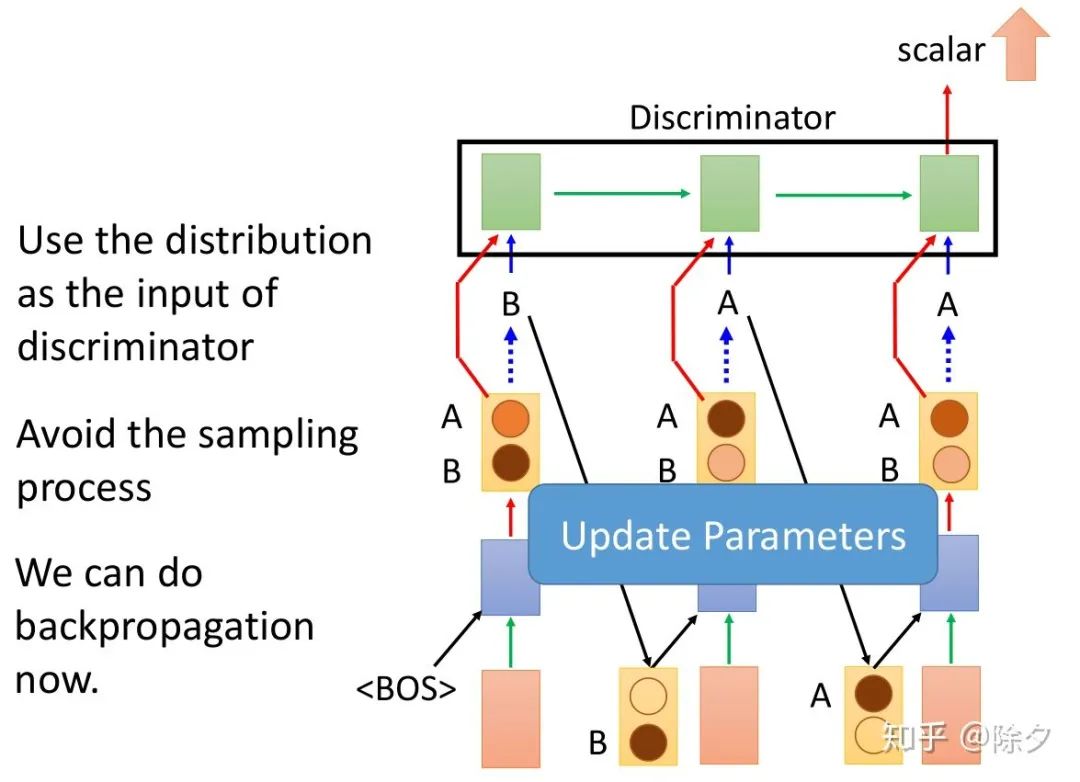 另一种解决方案是避开采样,直接把生成器生成的输出分布向量输入给判别器。