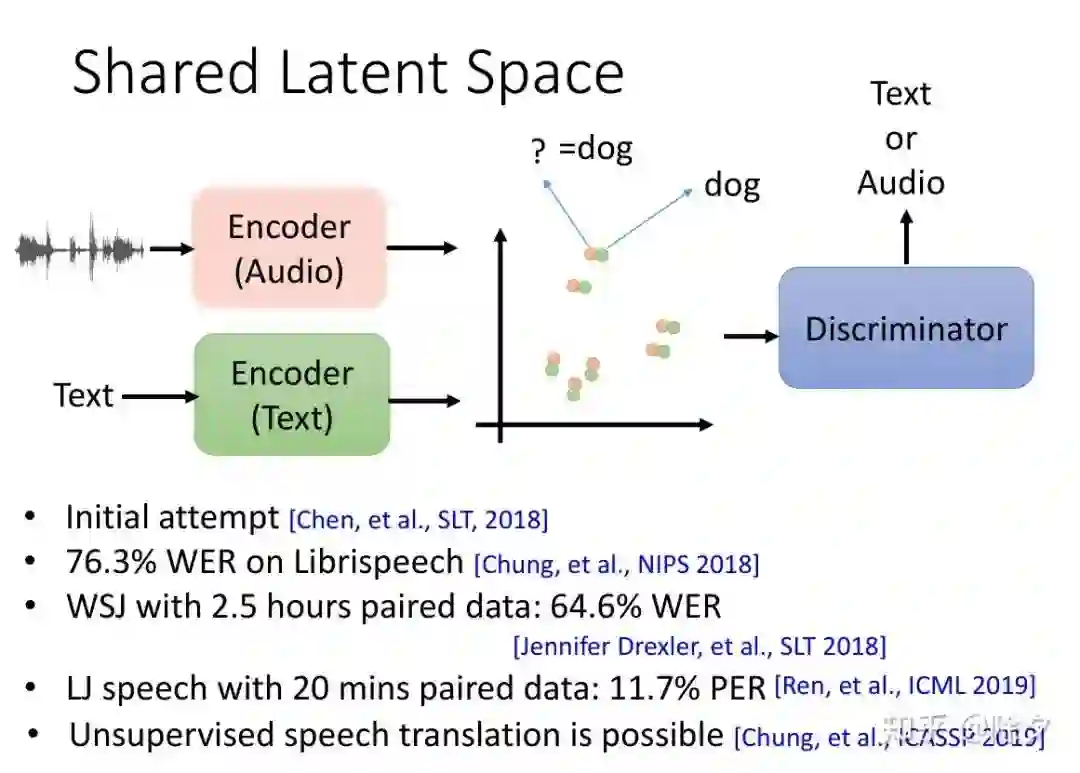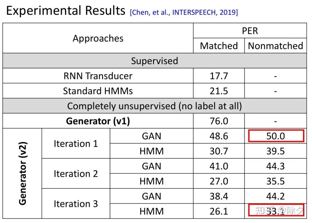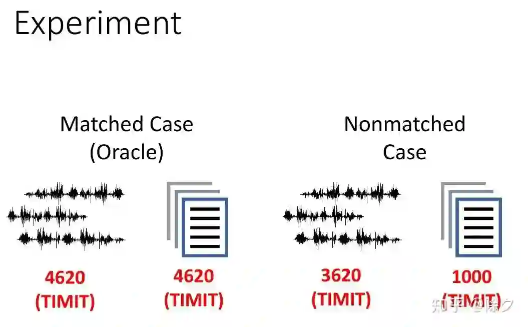 这个结果做在 TIMIT 语料上。前面那种是语料中,语音和文字之间有一一对应关系,但没有其配对的标签。后面那种是,语料中语音和文字之间没有一一对应关系。
