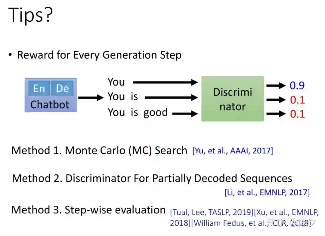 让生成器能在每一步生成都获得奖励的方法有三种。第一种是用蒙特卡洛搜索。它和 AlphaGo 的方法很像。生成器G先采样生成出很多以 You 开始的句子,统统丢给判别器D去判断当前的子序列有多好。第二种方法是训练一个特殊的判别器,它可以计算一个子序列的奖励。最后一种方法也是训练一个特殊的判别器,于第二种不同在,对于输入的完整序列,它可以一步步读序列算分数。实验表明,蒙特卡洛方法是有效的比较好,但它的计算量比较大。第三种方法可以和蒙特卡洛搜索方法效果差不多,而且运算量比较少。第二种方法效果一般。