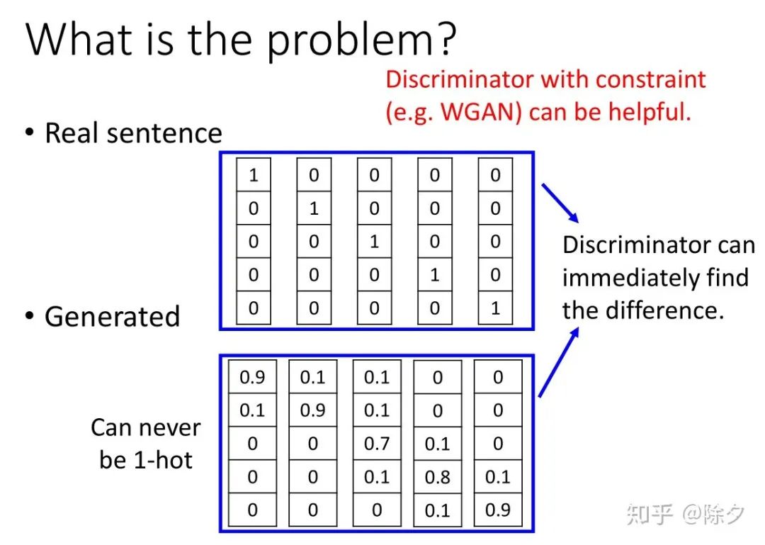这个想法这么单纯,为什么没有被广泛使用呢?因为生成器输出的分布和正常的句子之间还是有很大差别。判别器可以通过这种差别轻易判断二者哪个是哪个,而不是通过文本的风格判断。这个在实作中也不是完全不可行的。如果采用的是比较弱的判别器,或训练的时候,下比较大的限制,比如用 WGAN,去弱化判别器的能力,也许它就没有那么轻易地能判断出真实的离散句子和连续的生成分布的差别。当然我们也可以不用独热编码去表示输入句子,而是用它的连续值表征,比如 Word2vec 或 BERT。对于生成器的输出,我们也不用其归一化后的分布,而是用嵌入的加权和。或许这样就可以制造出两组本质上没那么容易被区分开的表征,而只能让判别器去通过其文本风格区分。这一招还是大有可为的。