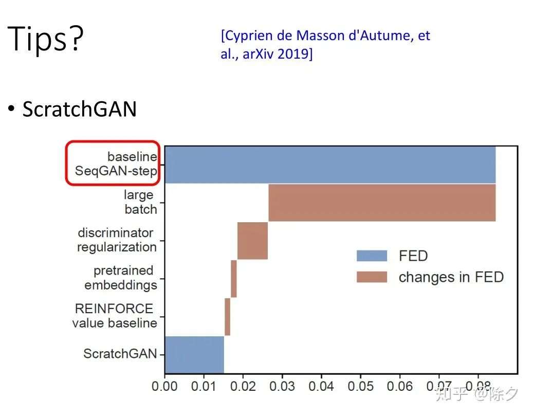 DeepMind 将用强化学习去训练生成器的各种技巧都试了一遍,并把实验都汇总在一篇叫ScratchGAN 的论文中。他们用的评估指标是越小越好的 FED。ScratchGAN 给我们的启发是。SeqGAN-step 是最重要的技巧。如果不用我们是训练不起来的。