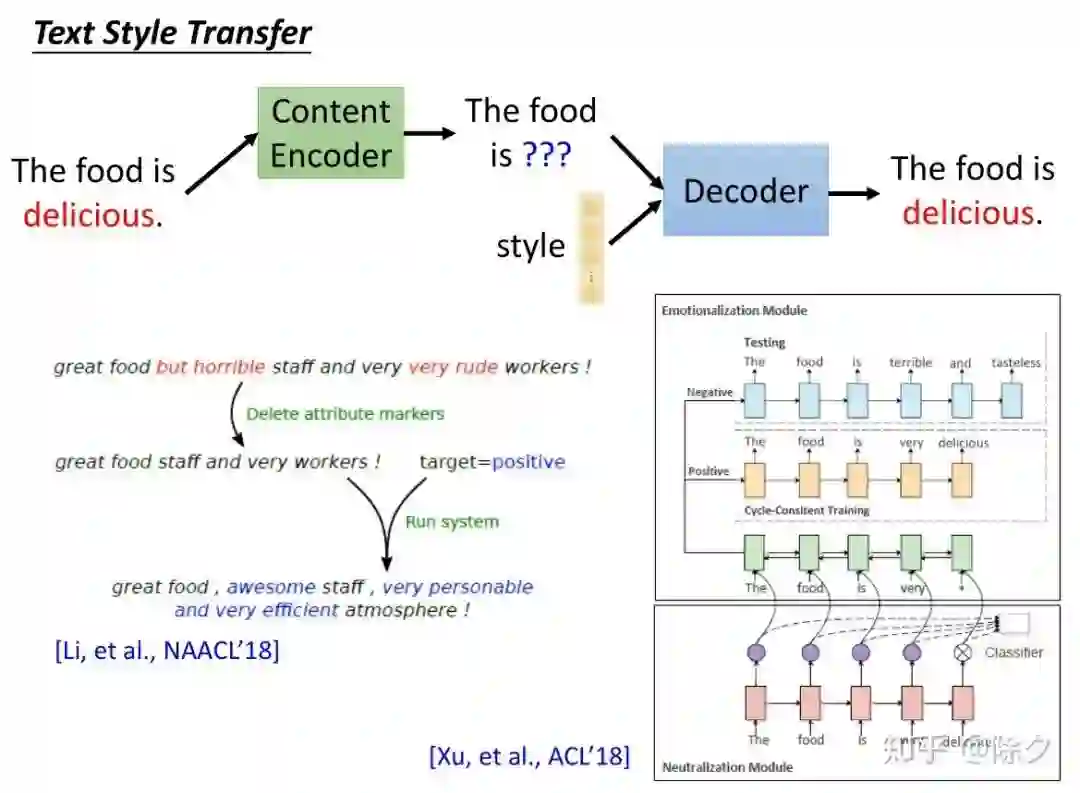 • [Li, et al., NAACL’18] Juncen Li, Robin Jia, He He, Percy Liang, Delete, Retrieve, Generate: a Simple Approach to Sentiment and Style Transfer, NAACL, 2018