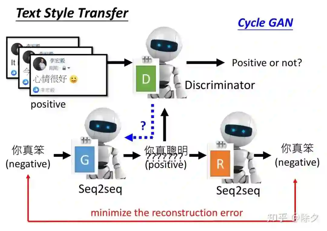 我们可以用 Cycle GAN 的方法来做无监督的文本风格转换。首先我们需要一个判别器 D,用来判断一个句子的情感是正面的还是负面的。同时,我们也需要一个生成器 G,用来把正面的句子转换成负面,或把负面的句子转换成正面。在 Cycle GAN 中,仅仅有生成器和判别器是不够的,我们还需要有另一个句子能把生成器 G 输出的句子重构回去的模型 R。对于 G 而言,它有两个目标,一个是确保判别器觉得它输出的句子是正面的,另一个是确保模型R,能把它输出的句子重构回它输入的样子。但文本中使用 GAN 的技术会有个问题。对于图像/语音训练的时候,我们会把生成器G和判别器D接在一起当作是一个比较大的网络。生成器G需要调整它的输出,让它的输出丢到判别器D中后,得出的结果是我们想要的。