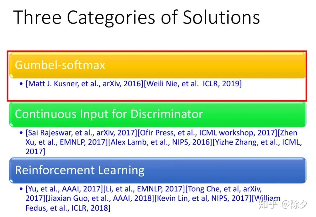 解决文本中 GAN 不可导问题,有三个主流的技术,它们分别为 Gumbel-softmax,把判别器的离散输入变成连续输入,强化学习方法。