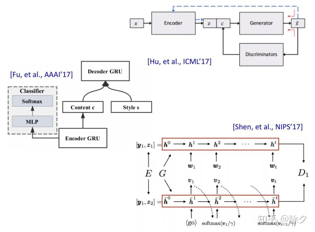 文献上确实有不少这类的方法。这里我们不细讲。只是列出一些文献作为参照。它们的思路和用在语音风格迁移的方法大同小异。最早类似的方法用的是 GAN 的技术。这些都是比较早的,17年的论文。但近年来,这一招没有那么流行了,反而是 Cycle GAN 的方法比较好。这是因为文字要压缩成 embedding,其实并没有那么容易。在16-17年阶段,很流行用 VAE 去训练 Seq2Seq 的编码器。还有一个原因是,文字本身是离散的。如果我们把它压缩到一个隐变量空间,它会有很多空洞没法产生文字。