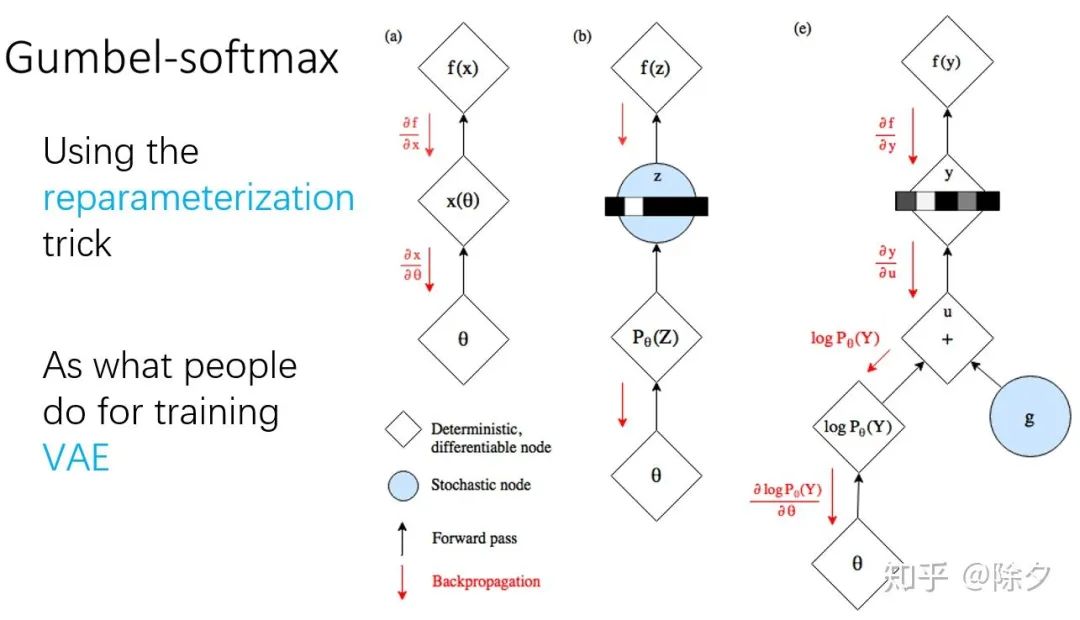Gumbel-softmax 我们这里简单略过。它的思想和 VAE 很像,用了重参数化的技巧。这个技巧让原本采样这件不能微分的事变得可以微分了。更详细的解读可以看苏剑林大神的个人博客,这里就不冗述。