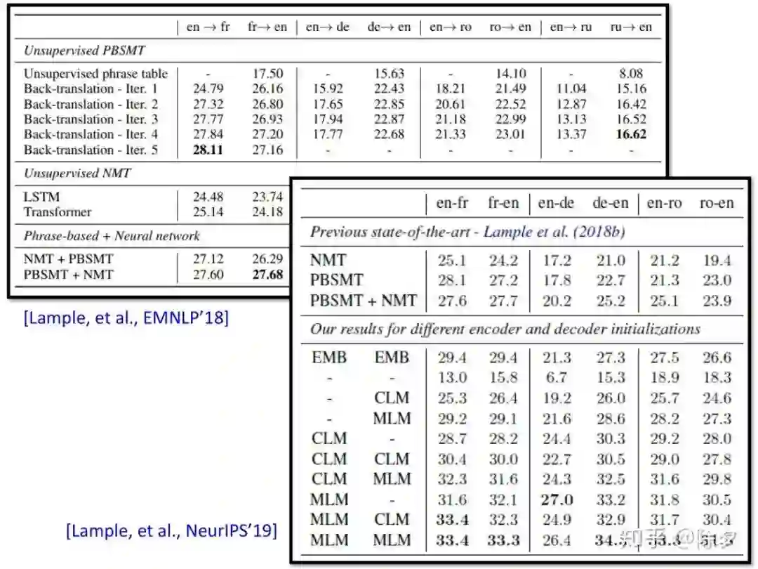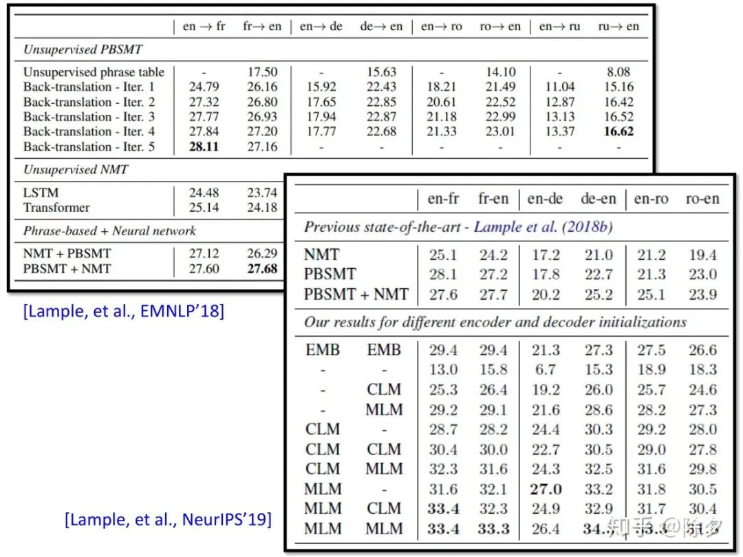 这种无监督的翻译结果也非常惊人。无监督学习用 10M 个句子学到的效果相当于有监督学习用 100K个句子对得到的效果。