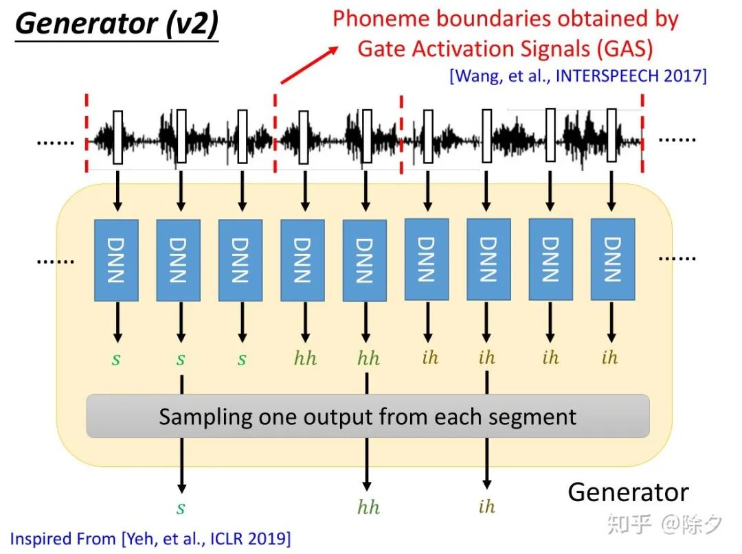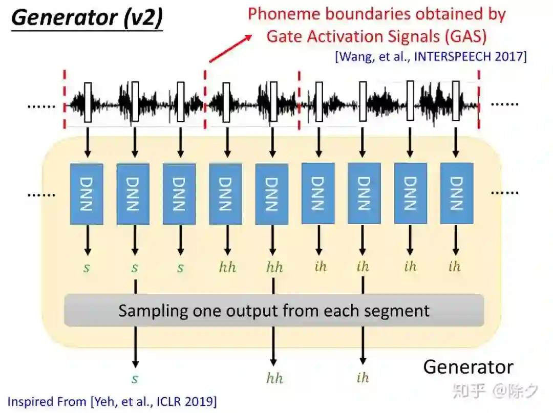 于是我们想办法进一步提升。这个技巧受到一篇 ICLR 19 的启发。我们可以先用一套叫 GAS 的技术找出 Phoneme 对应的语音上的边界。每个声学特征向量都会接入一个神经网络去分类出它的 Phoneme。往下再用采样去取一个声学边界中的一个 phoneme 结果。这便作为生成器的输出。整体训练目标是取骗过判别器。判别器需要从真正的 Phoneme 和 生成的 Phoneme 中区分出哪个是真的。为什么这里不用 RNN ,而用 DNN 呢?因为我们不希望生成器随便产生 Phoneme 序列。因为这样对判别器来说太好判断真假了。RNN 有时可以无视声学特征,自己输出一堆好的 Phoneme 序列,去骗过判别器。