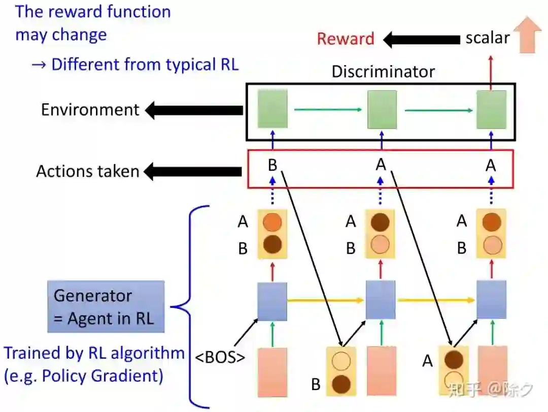 最后一招是用强化学习来解。什么东西不能微分,就用Policy Gradient 来硬训练一发。我们把生成器G看作是强化学习中的 Agent。从它的输出分布中采样出来的 tokens,看作是强化学习中的 Action。判别器D则是强化学习中的互动环境。判别器的输出,便是奖励 Reward。这样问题就变成了强化学习中,训练 Agent 让它在环境中累计期望奖励最大的问题。但这边 GAN 和 强化学习有一点不一样的是,强化学习中,环境,即通过 Action 计算出 Reward 这件事是固定的。比如在下围棋时,输赢的规则是固定的。游戏中,杀死一只怪物得多少分也是固定的。但现在判别器D 是一个网络,它的参数更新会让环境发生变化。游戏规则的改变会让强化学习的训练变得更加困难。