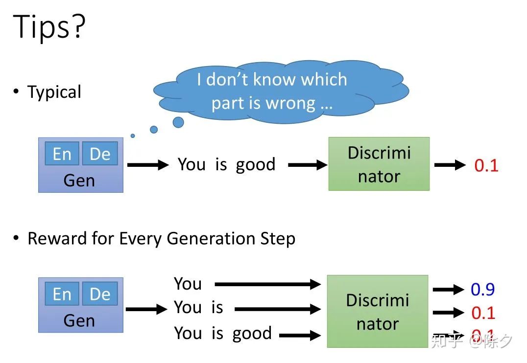 为什么 RL 的训练这么困难?因为判别器D要看完完整的序列后,才会给它一个分数。但对于生成器G而言,到底是哪一段文字让这个序列的分数变低,却无法从反传的梯度中反馈知道。因此生成器G的奖励是非常稀疏的。它和下围棋很像。一整盘棋下完,才知道输赢。所以我们需要一种技巧能让生成器在每一步生成都获得奖励反馈。这样生成器就能根据让奖励下降生成出的 token,去更精准地更新参数。