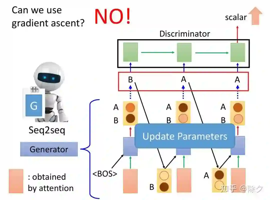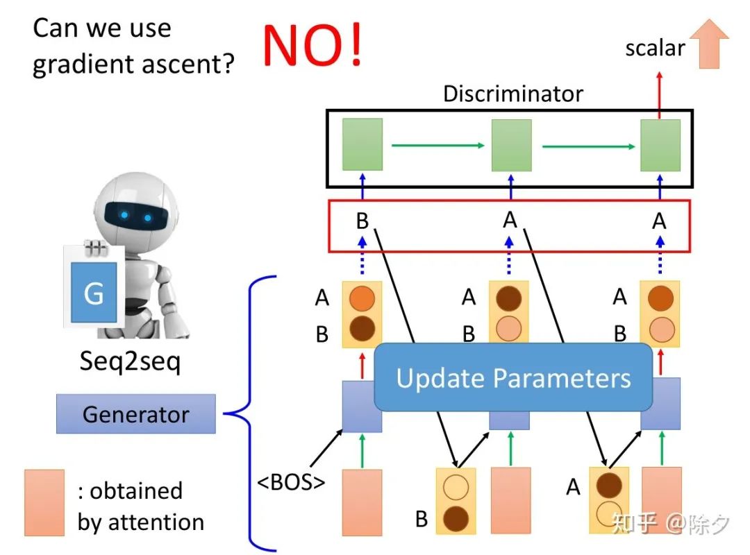 文本上,生成器 G 的输入输出长度可能会不同,不像语音那样输入输出长度一样可以用CNN解决。所以这里生成器G通常是一个序列到序列的模型。判别器 D 的输入是一个序列,输出是一个类别。生成器G生成输出的时候,存在一个采样的操作。如果我们把生成器G和判别器D当作一个模型去训练,这个采样的操作由于不可微分,所以整个网络反向传播时,中途会断掉。也就是说,我们无法用梯度下降的方法来训练我们的网络。文字是离散的,反向传播不可导。因此我们需要想一些额外的技术去解决。