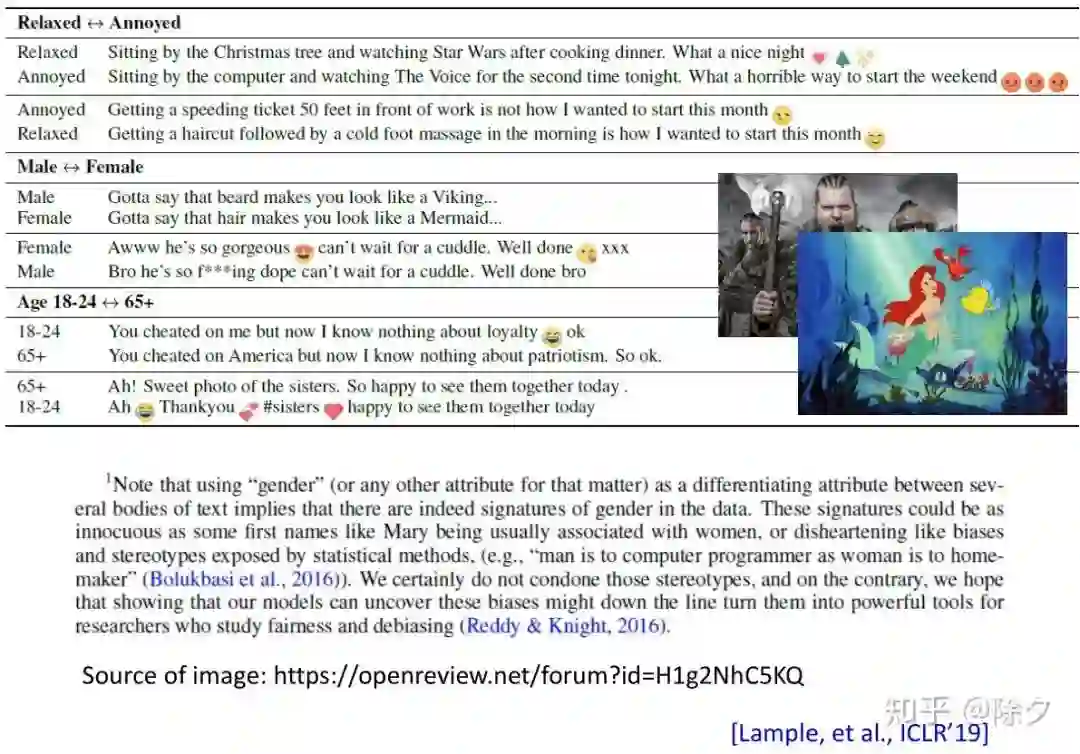 • [Lample, et al., ICLR’19] Guillaume Lample, Sandeep Subramanian, Eric Smith, Ludovic Denoyer, Marc'Aurelio Ranzato, Y-Lan Boureau, Multiple-Attribute Text Rewriting, ICLR, 2019