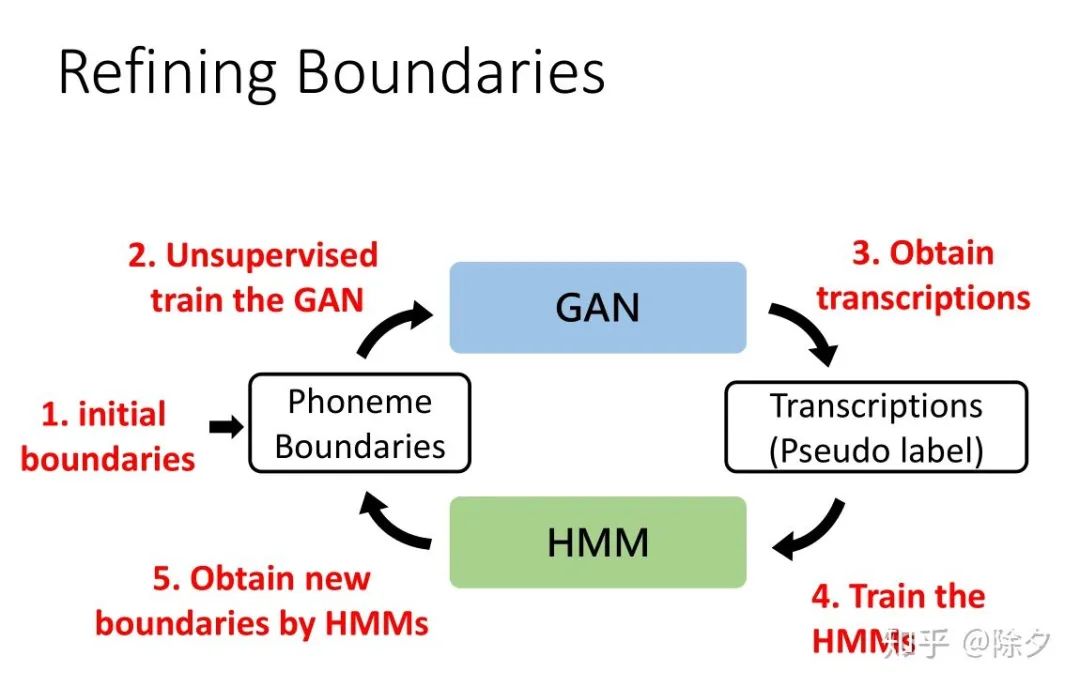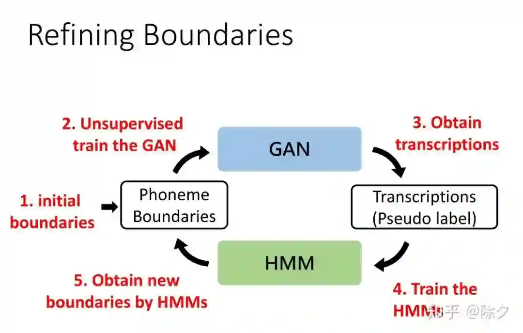 接着,我们发型,Phoneme 边界的好坏,对表现影响非常大。所以我们希望一边训练无监督的语言识别,一边想办法找到更好的 Phoneme 边界。我们先会有一个初始的边界,用CycleGAN 的方法得到第一代的语音识别系统。这个系统可以去识别那些无标注的声音信号,这样就能得到一些伪标注数据。接着我们用这些伪标注数据去训练一个 HMM,可以更好地找到 Phoneme 边界。如此反复迭代,我们就可以不断提升语音识别系统的表现。