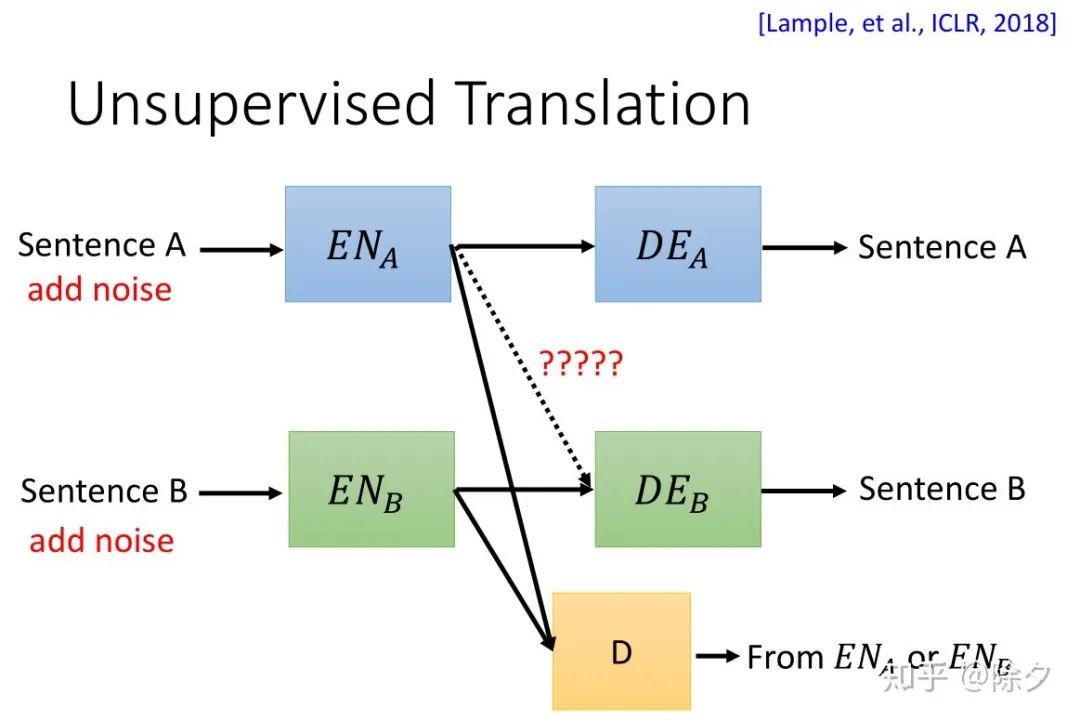 以上是词到词的无监督翻译。现在我们来说一下句子到句子的无监督翻译。我们想把语言A翻译成语言B,但是我们没有语言A和语言B的配对数据。我们先去训练两个序列到序列的去噪自编码器,它们分别能重构语言A和语言B的句子。接着,我们希望语言A的编码器输出的嵌入向量,丢给语言B的解码器能够解码出其意思相近的语言B。但对于语音B的解码器来说,这段嵌入向量可能是一段乱码,它很难解码得到正确的翻译。所以我们要用各式各样的技巧来解决这个问题。比如我们可以加一个判别器,用来判断语言A的编码器输出向量和语言B的编码器输出向量有什么不同。两个编码器除了要让其各自的解码器能重构原来加上噪音的句子以外,还需要骗过判别器,让它区分不出二者的差别。