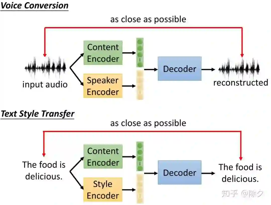 之前语音风格转换有两种做法。一种做法是用 CycleGAN,另一种是做特征解纠缠。文本版是不是也可以用特征解纠缠的方式去做呢?答案是可以的。我们可以训练两个编码器,一个把决定文字内容模板的特征抽出来,另一个把决定文本风格的特征抽出来。解码器再利用两个特征向量去还原出原本的句子。训练的时候,当作一个自编码器训练。做文本风格转换的时候,我们只需要让文本输入给内容编码器提取出内容模板向量,再加上另一个别的风格的特征向量,让解码器解码,就可以得到风格迁移后的文本。