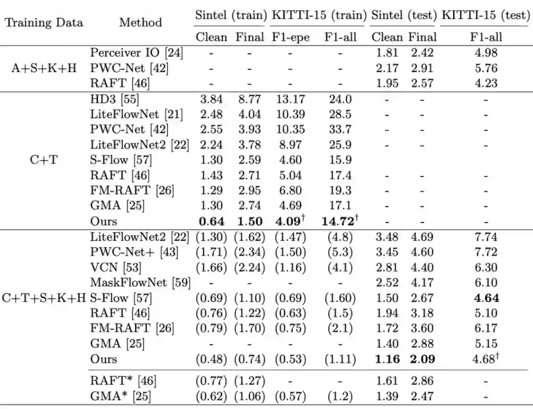 Sintel Benchmark 上的精度分析:在 FlyingChairs、FlyingThings、Sintel 训练集这三个数据集上训练,在 Sintel 测试集上评测。FlowFormer 将误差降到了 1.16 和 2.09,下降比率达到了 16.5% 和 15.5%。