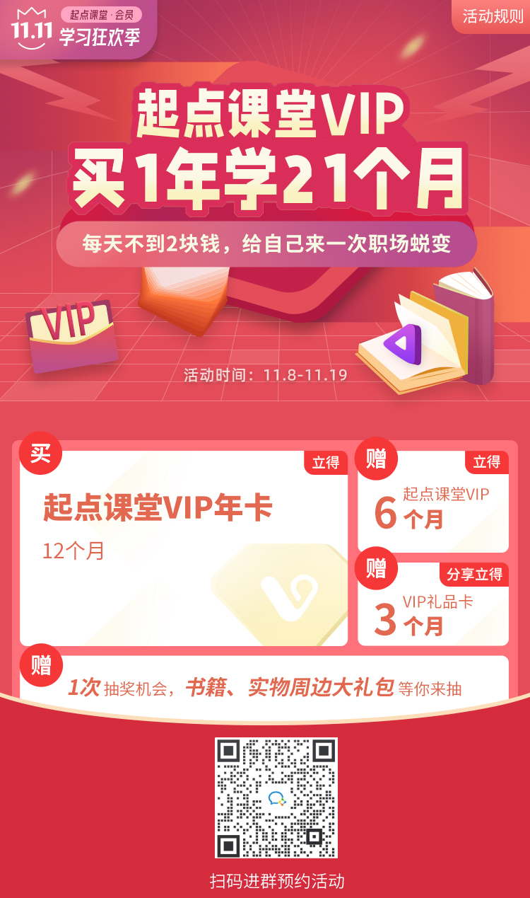 活动期间购买1年起点课堂会员,将额外送9个月会员时长!即一次性得21个月会员。