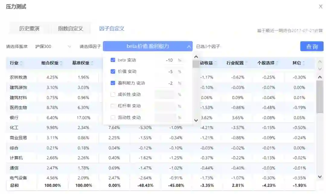 基于上述风险因子,萝卜投资开发了针对A股市场的压力测试工具,允许灵活选择风险因子以及对应的变动幅度。利用这套工具,投资者可以基于组合当前的持仓特性,分析在自定义的压力场景下每个行业的表现。