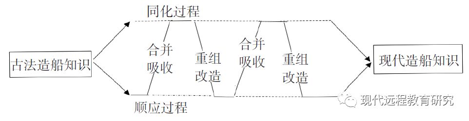 同化顺应学习是大国工匠们常见的一种学习类型,这种学习能有效扩展、更新工匠的知识技能。以方文墨为例,从沈飞民品公司调入沈飞军品厂这一心目中的技术胜地之后,他开始拜师学艺,集纳各家之长,努力继承优点,想办法改正缺点,他的技术在短时间内有了质的飞跃。方文墨的这一学习过程就同时包含了同化和顺应,兼有量的扩展和质的提升。在古法造船基础上学习现代造船知识的张兴华经历的也是同化顺应学习交融、互动的过程:痴迷于造船的张兴华不满足于古法造船,他希望掌握现代造船知识,毕业于大连海洋大学船舶制造专业的女儿成了他最好的老师。之前张兴华用手画图纸,误差最大时达10毫米,学会用电脑设计图样之后,他画图纸的精确度能达到1毫米。基于比耶格等人的同化顺应学习模型,张兴华的同化顺应学习可以简化为图2所示的模型。该模型既演示了同化顺应的学习过程,也含纳了最终学习结果。