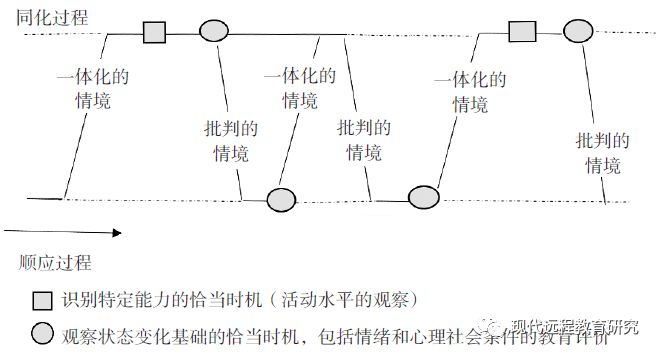 皮亚杰等人把同化顺应视为学习的基本过程,其中,同化学习是指把新的知识技能合并、吸收到已有的知识技能之中,从而使先前学习所构建的心智图式加以丰富和扩展。而当新的知识技能无法链接到已有图式中时,个体就需要重组和改造已建立的图式,从而形成新的知识技能,这一过程就是顺应学习。比耶格等人用波状模型描述了理想状态中的同化和顺应学习之间的互动(见图1)。该模型表明了一个学习程序如何从(主要是)同化的过程,经由批判的情境转向(主要是)顺应的过程,经由一体化的情境回到(主要是)同化的过程。该模型还揭示了哪些时间点分别对于活动水平的教育观察和状态改变的观察是比较理想的。由于同化顺应被认为是在一个鲜活的认知过程中同时发生、不可分离的,“纯粹”的顺应和“纯粹”的同化在认知生活中是无处可寻的(克努兹·伊列雷斯,2014),现实中,工匠们的同化学习和顺应学习边界也比较模糊,故而本研究将二者并称为同化顺应学习,即既包括新知识技能被合并、吸收到已有知识技能之中,也包括重组、改造已有知识技能以适应客观环境的变化。只是,同化顺应学习有时主要侧重同化学习,有时主要侧重顺应学习,二者所占比重有所差异。此外,顺应学习相比同化学习通常更为复杂、难度更大。