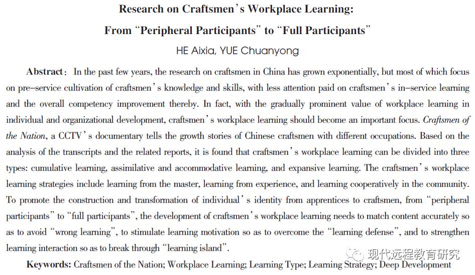 引用:何爱霞,乐传永(2018).从“边缘性参与者”到“充分参与者”的工匠工作场所学习研究[J].现代远程教育研究,(6):55-63.