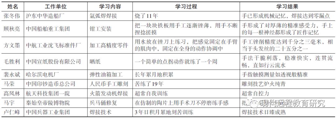 在近代学校教育出现之前,学徒制是人类技艺传承的主要手段。在手工作坊或店铺等真实的工作场所中,师徒共同劳动,徒弟在师傅指导下学习知识和技能。直至今天,学徒制依然是技能人才培养的重要形式。在《大国工匠》8集纪录片的转录文本中,“师傅”作为高频词出现达30次,其他报道中也多次涉及这一话题,因而,向师傅学习是多数大国工匠工作场所学习原初而基本的路径,这对走上工作岗位之前未在技校等机构接受过职业技能教育的工匠而言更是如此(见表2)。