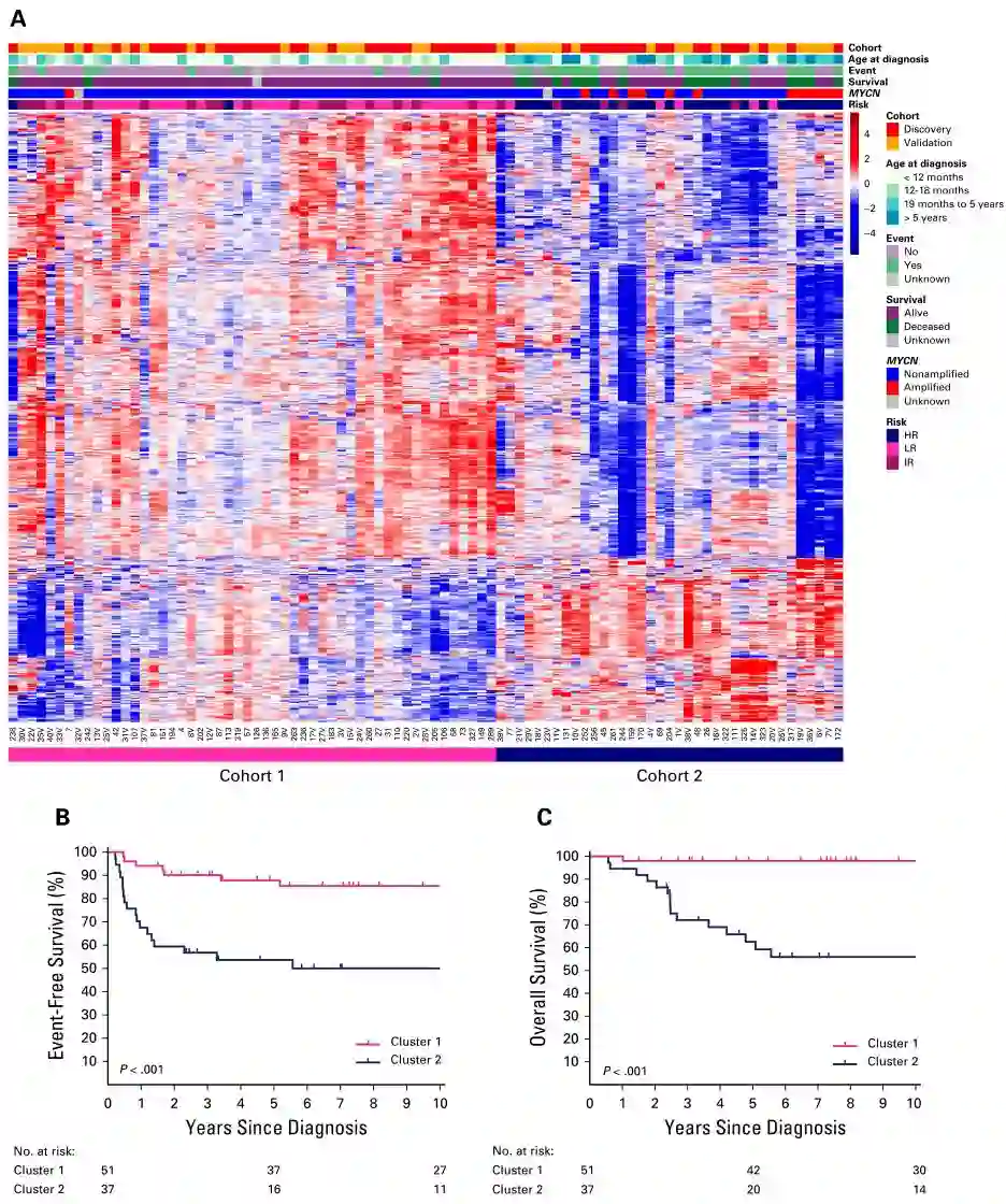 不同分期的神经母细胞瘤患者预后差别很大。中-低风险(LR: low-risk; IR: intermediate-risk)神经母细胞瘤患者通过治疗可达到非常好的预后效果,但高风险(HR: high-risk)患者的预后很差,只有不到一半患者能长期生存。由于HR神经母细胞瘤患者存在显著的异质性,因此,患者对标准治疗和备选治疗的敏感性在后续治疗和预后中至关重要。科学家认为,解决这一临床难题的方法之一就是利用新的生物标志物对患者进行区分。
