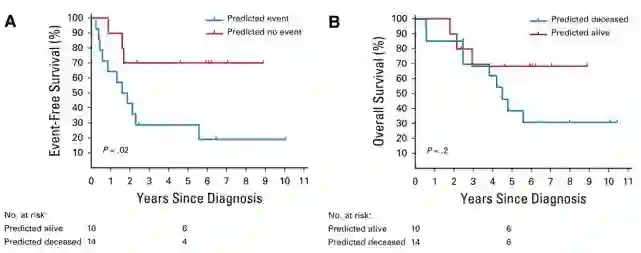 随后,研究人员利用高风险患者的总体生存率(OS)建立了线性判别模型,以对高风险患者预后进行预测。分析结果显示,该模型可准确预测24例中18例(验证组和儿童肿瘤组)的无进展生存率(EFS)。该模型预测患者为预后良好与不良的灵敏度和特异度分别为70%和79%,阳性预测值78.6%;预测为预后良好和预后不良患者的5年EFS分别为70% 和28.6% (图2A)。