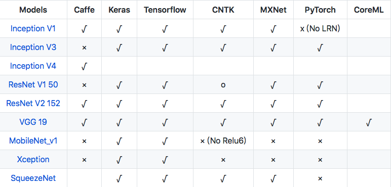 在一些当前框架所支持的ImageNet模型上测试模型的转换功能。