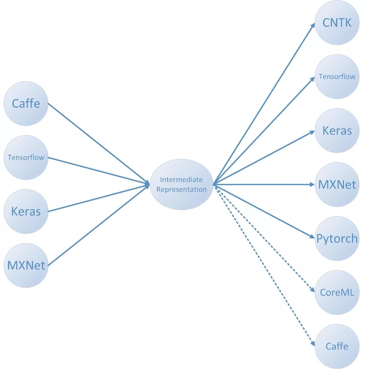 为此,我们提供了一个这样的模型转换器,来帮助开发人员通过中间表示格式在不同框架之间实现模型的转换。