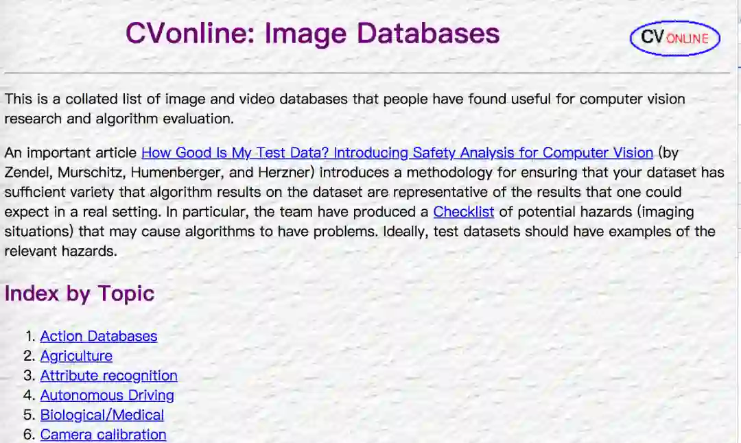 内容:This is a collated list of image and video databases that people have found useful for computer vision research and algorithm evaluation.