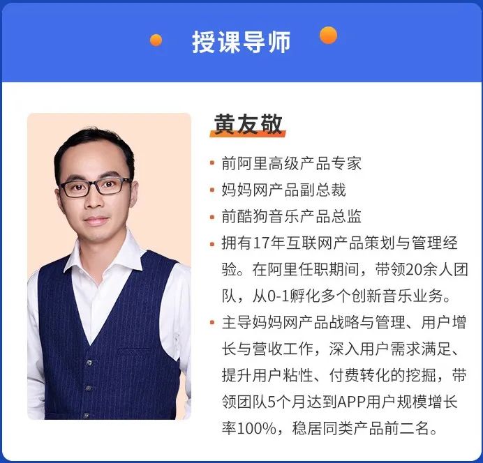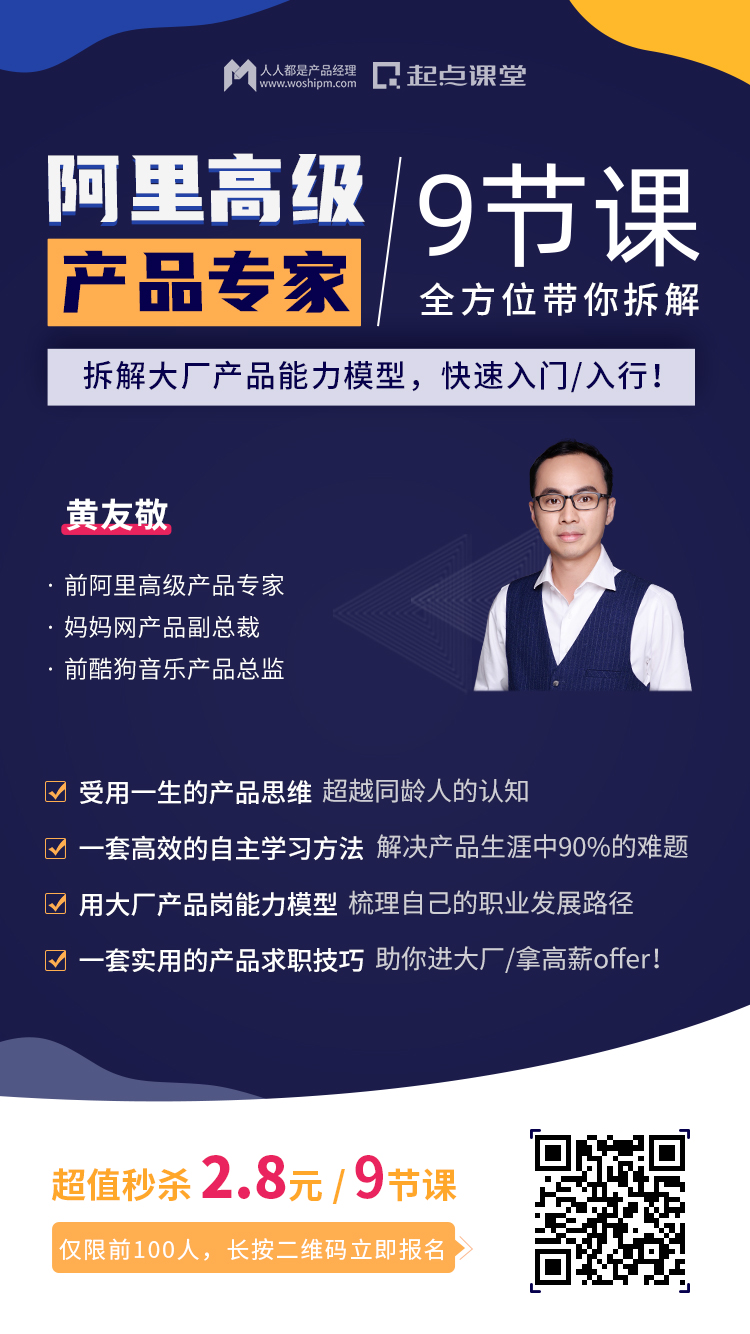 为此,「人人都是产品经理」旗下起点课堂,请到了两位一线大厂的总监级老师——来自阿里巴巴的高级产品专家黄有敬老师,以及来自腾讯的社交平台运营负责人潘至鹏老师;