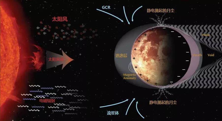 太阳持续不断的向四面八方“吹”出超声速带电粒子流,被称为太阳风。由于月球没有磁场、大气层的保护,太阳风能够直接“吹”到月球表面上,太阳风中的质子和离子作用到月壤表面会反射和溅射出能量中性原子(Energetic neutral atom,简称ENA)和其他粒子。同时,光照会导致月表充正电荷,等离子体会导致月表充负电,在月面阴阳交界处静电力会抛起月尘,所有这些抛出、溅射和反射出的物质组成了月球的逃逸层(图6)。科学家需要搞清楚月球逃逸层形成过程中各种机制的作用大小,这对于研究太阳系中许多与月球类似的星体(如水星、小行星等)具有重要意义。