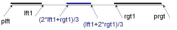 如果节点区间[clft, crgt]与[plft, prgt]存在如下关系:plft <= clft and crgt >= prgt,则[clft, crgt]区间里的点是[plft, prgt]的子节点。基于此假设我们就可以通过对区间的不断的向下划来获取新的区间。举例:如果在区间[plft, prgt]中存在一个空白区间[lft1, rgt1],如果要加入一个[plft,lft1]、[rgt1,prgt]同级的区间,只需插入节点:[(2*lft1+rgt1)/3, (rgt1+2*lft)/3]。在添加完节点后我们还留下[lft1,(2*lft1+rgt1)/3]和 [(rgt1+2*lft)/3,rgt1]两个空余的空间用来添加更多的子节点。