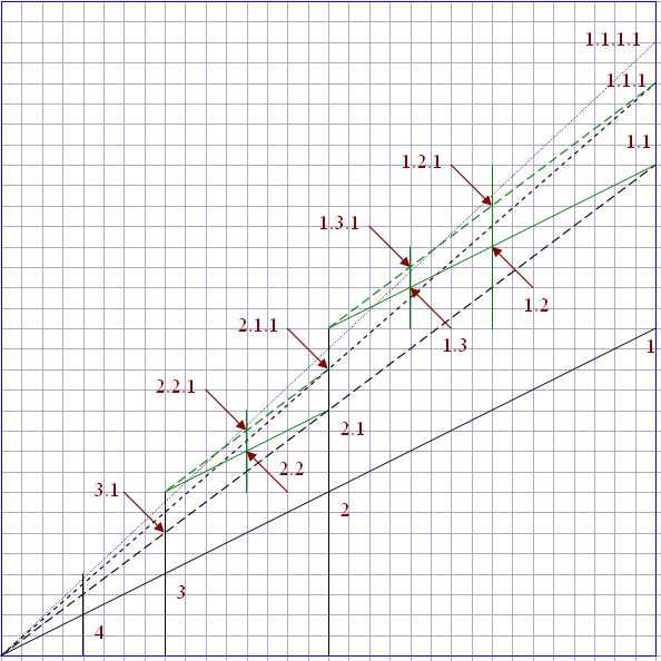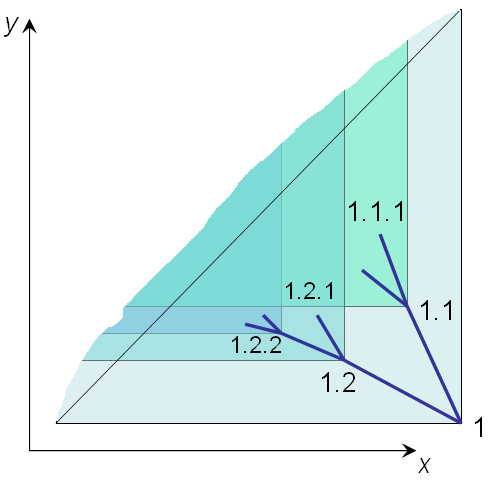 首先,我们在XY平面上定义2个点。深度优先集合点和广度有限集合点,针对点<x=1,y=1/2>的深度优先集合点为<x=1,y=1>,广度优先集合点为<x=1/2,y=1/2>。接下来我们定义第一个子节点的位置为父节点和深度优先集合点的中间点。兄弟节点则为前一个子节点到广度优先集合点的中间点,如上图所示,节点1.2的位置为<x=3/4, y=5/8>。