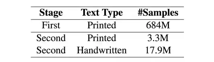 为了构建一个大规模高质量的数据集,研究员们从互联网上公开的 PDF 文档中随机选取了两百万张文档页面。由于这些 PDF 是数字生成的,因此通过把 PDF 文档转换为页面图像,然后提取文本行和裁切图像就可以得到高质量的打印体文本行图像。第一阶段的预训练数据一共包含6亿8千万文本行数据。