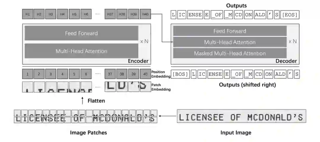 文本识别致力于理解文本图像并将视觉信号转换为自然语言符号。该任务通常使用编码器-解码器架构,现有方法采用了基于 CNN 网络的编码器进行图像理解,以及基于 RNN 网络的解码器进行文本生成。