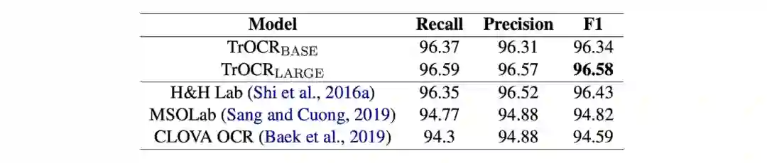 表3: 大规模预训练的 TrOCR 模型在 SROIE 印刷体数据集的实验结果