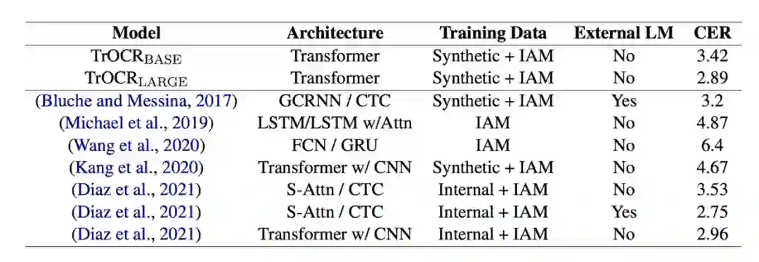 TrOCR 使用了来自于图像切片的信息,获得了与 CNN 网络相似甚至更好的结果,说明经过预训练的 Transformer 结构可以胜任提取视觉特征的任务。从结果来看TrOCR 模型使用纯 Transformer 结构超过了所有仅使用合成+IAM 数据的方法,同时在没有使用额外人工标注数据的情况下,取得了和使用人工标注数据的方法相近的结果。