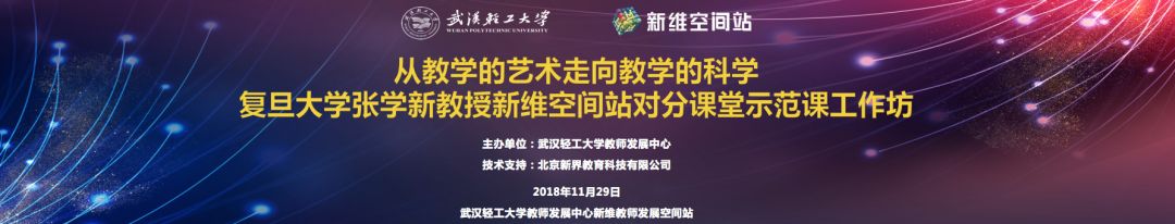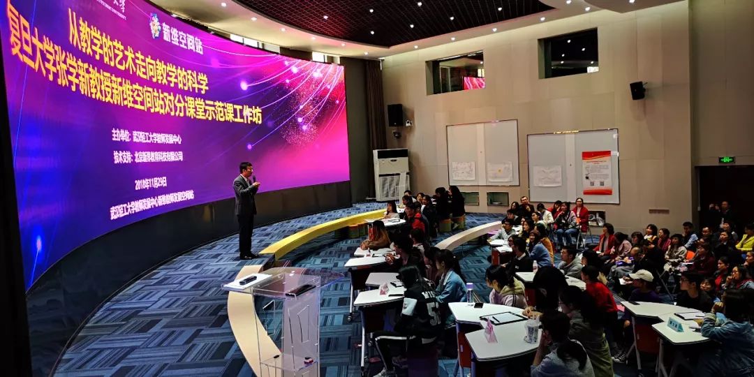 2018年11月29日周四14:00-17:00,武汉轻工大学教师发展中心与北京新界教育科技有限公司“新维空间站”联袂推出:史上首次创始人张学新教授对分课堂示范课工作坊!与来自武汉轻工大学40名本科生一起,精彩上演《脑与学习科学(入门篇)》对分示范课,解码和观摩对分课堂的实效与魅力,展示智慧技术与对分课堂的深度融合!示范课后开展《对分课堂:从教学的艺术走向教学的科学》专题报告,创始人亲自呈现和诠释对分课堂教学新模式,现场来自武汉理工大学、华中师范大学、四川外国语大学、中南财经政法大学、云南师范大学、武汉轻工大学、湖北大学、汉江师范学院、湖北工业大学、湖北商贸学院、湖南理工学院、四川化工职业技术学院、武汉城市职业学院、武汉船舶职业技术学院、武汉工商学院、武汉华夏理工学院、武汉铁路职业技术学院等20+所院校教师和管理岗参与示范课观摩和报告,线上直播约3000人观看。本次工作坊由武汉轻工大学覃晶晶老师担任主持,武汉轻工大学教师发展中心张胜全主任致辞。