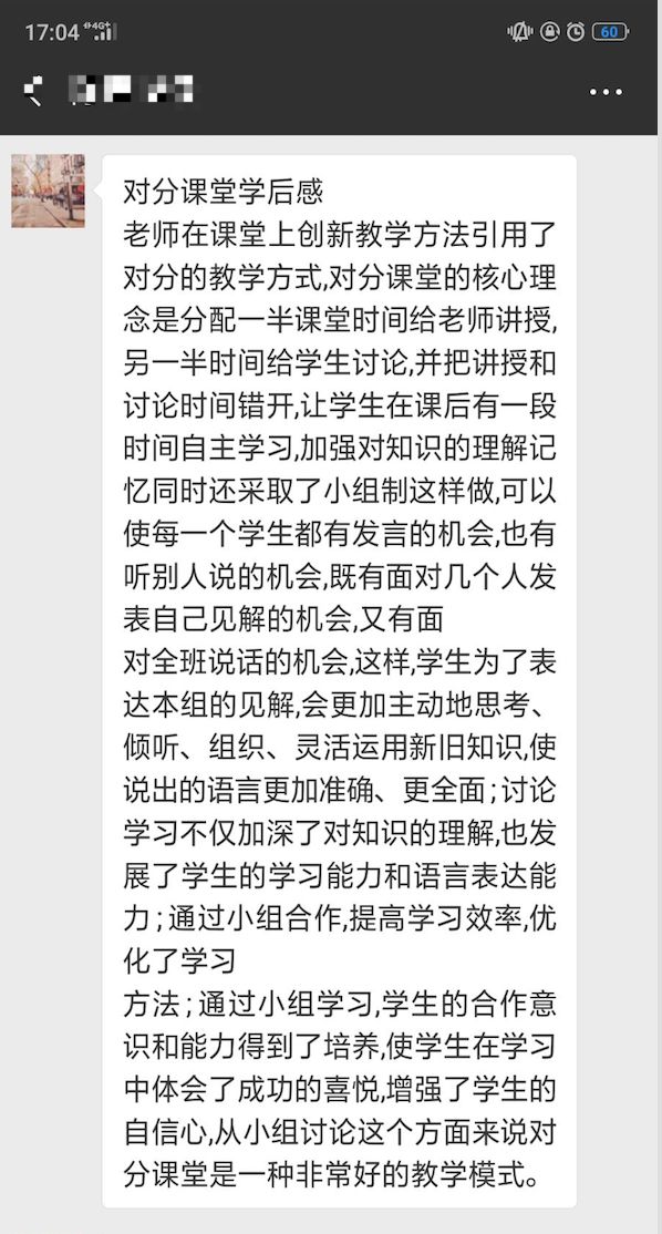 示范课结束后,一位学生讲到对分课堂让我对课堂学习的方式有了更新的认识,使我对⾃我思考有了新的认识。对分课堂上老师给了我们充分的时间去思考问题,使用慧板和⼩组形式让我对问题的了解更加全面,可以更加直观地了解课堂上别的学⽣优秀新颖的思想。
