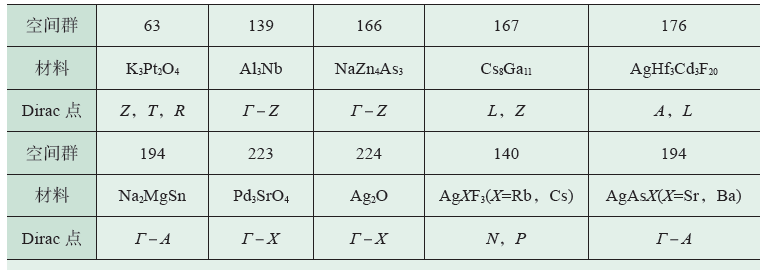 表5 一些费米面比较干净且Dirac 点离费米面较近的Dirac 材料[91,104],这里除了给出空间群(SG)信息、材料化学式,还给出了Dirac 点的位置(它们可以在高对称点上,比如K3Pt2O4的Z,T,R 上,或者高对称线上,比如Al3Nb的Γ-Z线上)