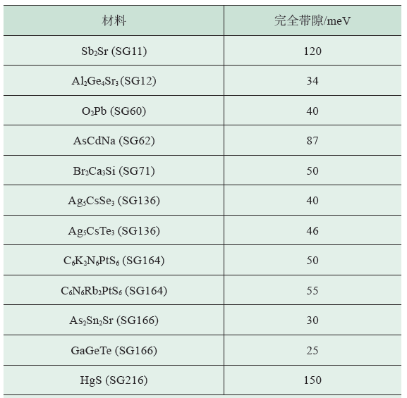 表4 我们预言的一些具有较大能隙(≥25 meV)的拓扑绝缘体材料,在“材料”列中,每一个化学式后面给出了所在的空间群