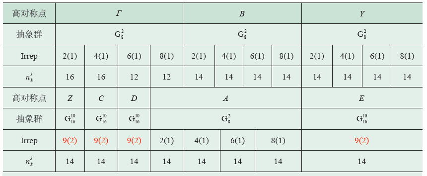 表2 β-MoTe2的56 个价带在高对称点Γ,B,Y,Z,C,D,A,E上不可约表示的占据数,根据文献[89],我们也展示了这些高对称点的对称群从属的抽象群,同时根据抽象群不可约表示给出小群不可约表示,比如Γ点的第一个不可约表示为抽象群G82 的第2 个不可约表示。在Irrep 行中,括号里数字标记维度。受到时间反演对称性的要求,Z,C,D和E 唯一一个2 维不可约表示必须成对出现(表中以红色显示了这些表示),因此相应的占据数应该表示为一对这样的表示所出现的次数,比如Z 点的不可约表示出现28 次,但是考虑时间反演对称的要求,计算得到的占据数(即时间反演对的占据数)为14