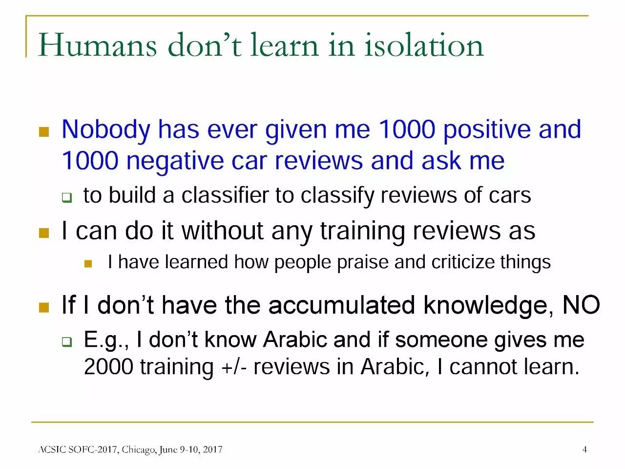 【新智元导读】第一届北美计算机华人学者年会暨计算技术前沿研讨会于 2017 年 6 月9-10日在芝加哥举行。这是会议是华人计算机学者的顶级盛会,新智元从会议主办方处获得了伊利诺伊大学芝加哥分校刘兵教授在会上的演讲PPT,刘兵教授以《打造能够终身学习的机器》为题,介绍了终身机器学习(Lifelong Machine Learning,LML)系统,尤其是 LML 在自然语言处理中的应用。