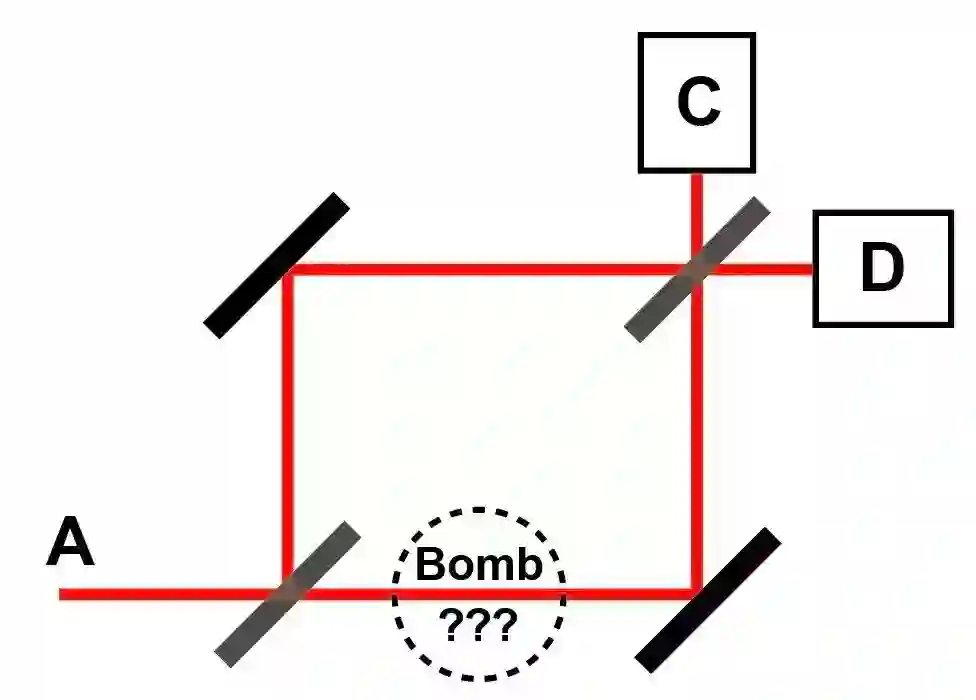值得注意的是,这里我们只发射了一个光子,如果这个光子在端口D被探测到,那么它一定没有通过干涉仪的下臂,然而我们却得到了炸弹存在的信息。这在后来被称为“无相互作用测量(interaction-free measurement)”。在此基础上,再利用量子芝诺效应(quantum Zeno effect),可以大大提升上述无相互作用测量的成功率。