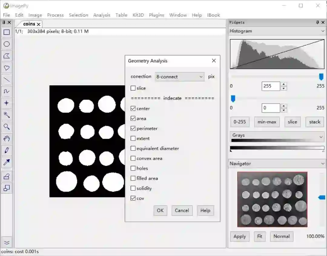 菜单:Process > Region Analysis > Geometry Analysis,对区域进行计数和指标分析,这里我们勾上cov,即对区域进行协方差椭圆拟合。ImagePy支持面积,周长,偏心率,丰满度等指标,其实上一步的过滤正是在这里的分析结果基础上进行的。