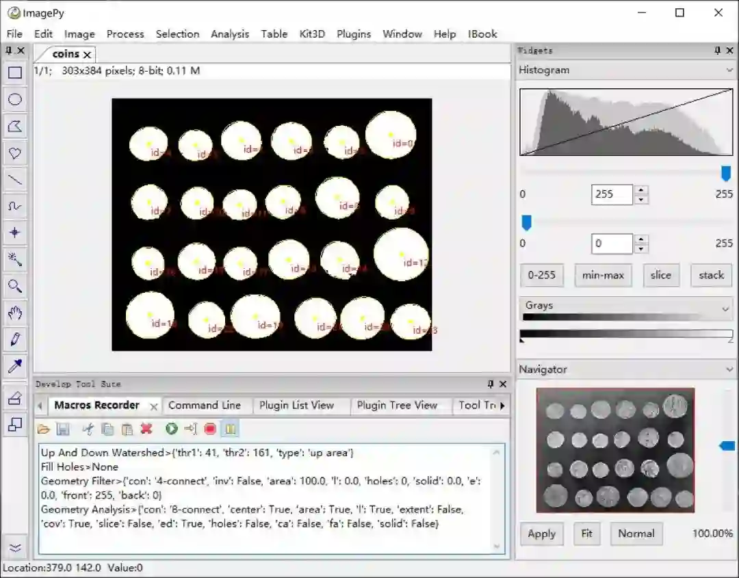 菜单:File > Local Samples > Coins,打开ImagePy的内置示例图像。ImagePy支持bmp, jpg, png, gif, tif等常见图像类型,支持xls, xlsx,csv表格格式,通过ITK插件,也可以获得dicom,nii等医学数据格式的读取存储功能,而通过OpenCV插件,可以获得wmv,avi等视频格式的读取存储功能。