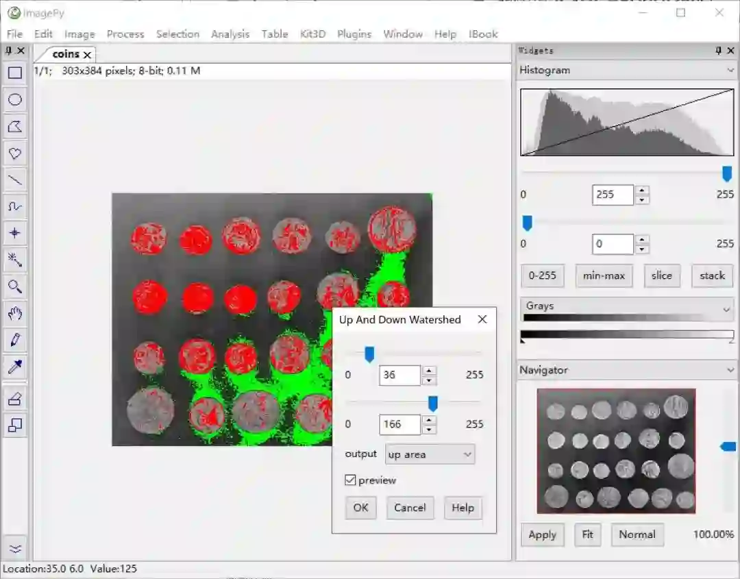 菜单:Process > Hydrology > Up And Down Watershed,这里选用一个复合滤波器,对图像进行sobel梯度提取,然后通过上下阈值标定作为mark,在梯度图上进行分水岭分割。滤波,分割是图像处理过程中的核心技巧,是最终测量结果成败的关键,ImagePy支持常见的高斯,均值,中值,梯度,拉普拉斯,差分高斯等滤波,也包含自适应阈值,分水岭等分割方法。