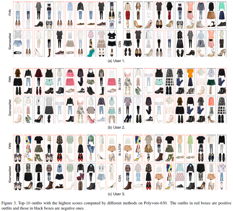 通过实验对比发现,论文提出的方法相比其他方法在AUC上有6.6%-12.1%的提升,NDCG有了19.56%-26.56%的提升。为了可视化排序质量,作者给出了三个用户Top10的推荐套装,发现论文所提方法优于现有方法。